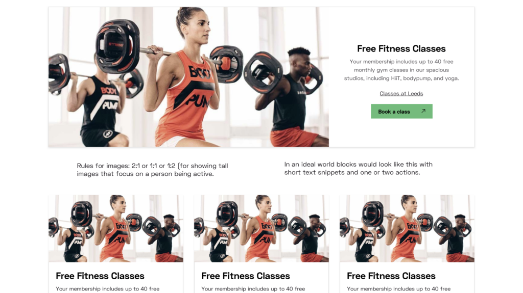 Site authors at Xercise4less embraced the systematic approach, seeing it as an opportunity to enhance their page building toolbox. I incorporated their “dream” blocks and provided a series of UI guidelines and layout specimens to demonstrate what they would be able to achieve. Invision’s Inspect and DSM tools were used to document the system and hand-off to developers.