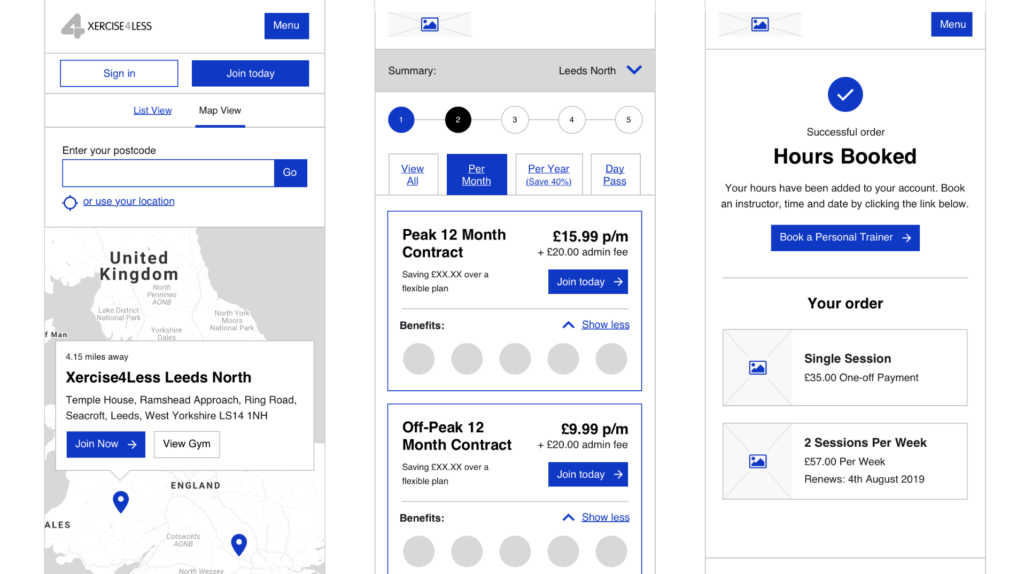 Wireframes were used to prototype the fitness class journeys.